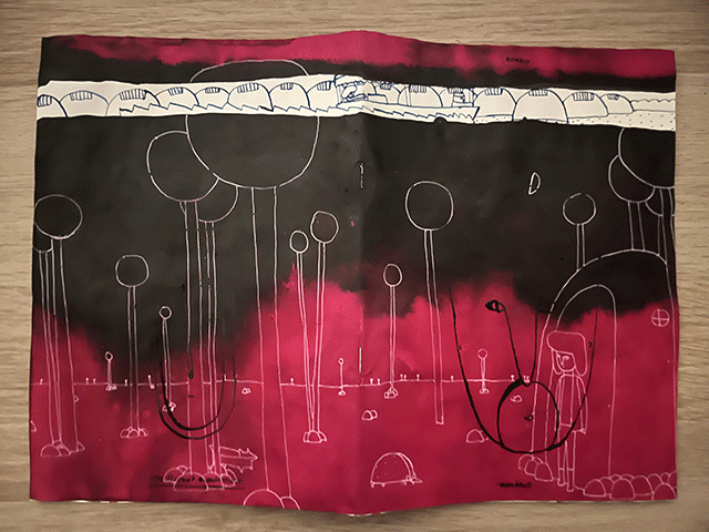 Les couvertures du numéro 5 sont réalisées au crayon à papier, réhaussé d’encre de Chine noire, d’encre bleue et mauve, parfois d’encre de Chine ou de stylo bille blanc, et parfois aussi de craies pastel vertes et jaunes.