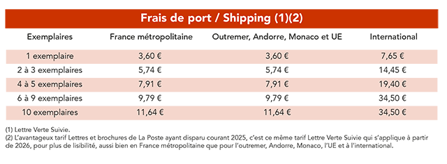 Les frais de port sont alignés sur les tarifs postaux français en vigueur (1) :